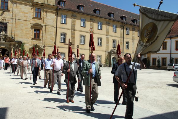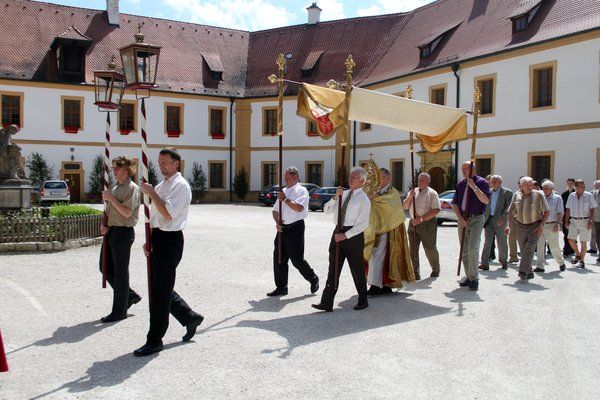 Mit Kreuz, Bruderschaftsfahne und Bruderschaftsrat voraus zogen Pfarrer Sturm mit dem Allerheiligsten in der Monstranz sowie viele Gläubige dann um den Ortskern als Bekenntnis zum Allerheiligsten Altarsakrament.