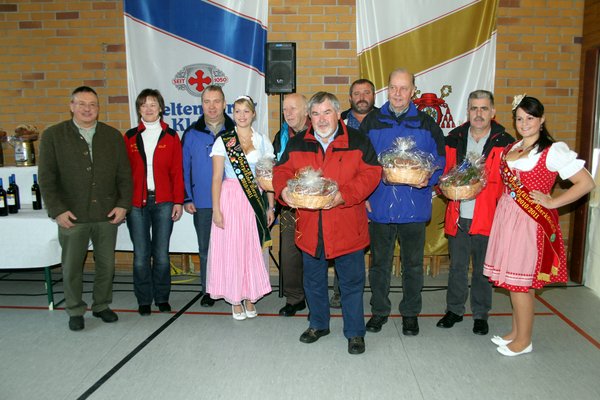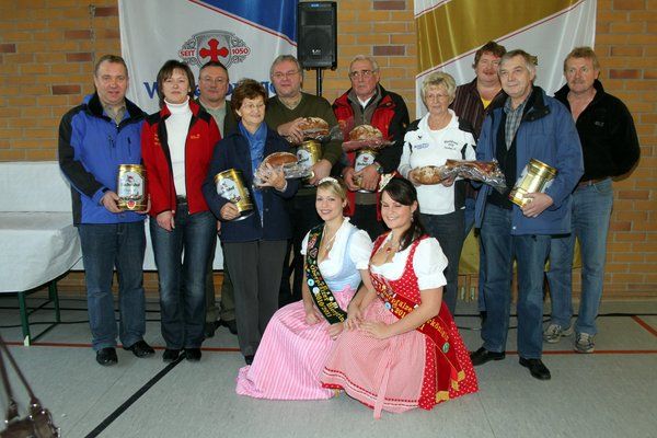 Anschließend überreichten Bürgermeister, Braumeister Seebauer und Vorsitzende Annemarie Dollacker zusammen mit Bierkönigin und Bierprinzessin, letztere mit begehrten süßen Bussis,. den Vertretern der meistplatzierten auswärtigen Vereinen und den 12 wandernden Ortsvereinen ihre Preise: den einen Wein und Schmankerlkörbe, den Einheimischen leckere schwarz geräucherte Schinken, würziges Bauernbrot und jeweils ein Fünf-Liter-Fass-Bier Wintertraum“.