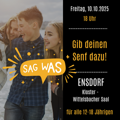 Am 10. Oktober 2025 lädt die Gemeinde Ensdorf alle Jugendlichen ab ca. 13 Jahren herzlich ein, im Wittelsbacher Saal direkt mitzureden. Start ist um 18:00 Uhr.